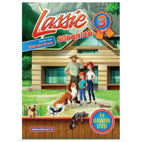 Slikanica in kratka vsebina zgodbe Lassie, priložen je tudi DVD risanke Lassie 1.